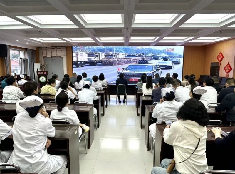 为铭记历史沧桑,传承抗战精神,引导全院职工厚植爱国情怀、勇担医者使命,9月3日上午,我院组织干部职工集中观看纪念中国人民抗日战争暨世界反法西斯战争胜利80周年大会直播。观看过程中,庄严的升旗仪式、振奋人心的讲话以及盛大的阅兵仪式,每一个环节都深深触动着在场职工的心弦。阅兵式上,受阅部队在长安街列阵,依次通过天安门广场,徒步方队步伐铿锵,充分展现出中国人民解放军改革重塑后新的军兵种结构布局;装备方队中,新型坦克、舰载机、歼击机等新一代传统武器装备以及无人智能、网电攻防、高超声速等新型作战力量震撼亮相,彰显了我国强大的军事力量和自主创新能力;维和部队方队的参阅和国际友人观礼环节,则传递出中国始终秉持的和平发展理念;空中梯队更是以整齐的编队、威武的气势飞过天安门上空,展示了空中作战力量的体系化水平和快速提升的先进战斗力。